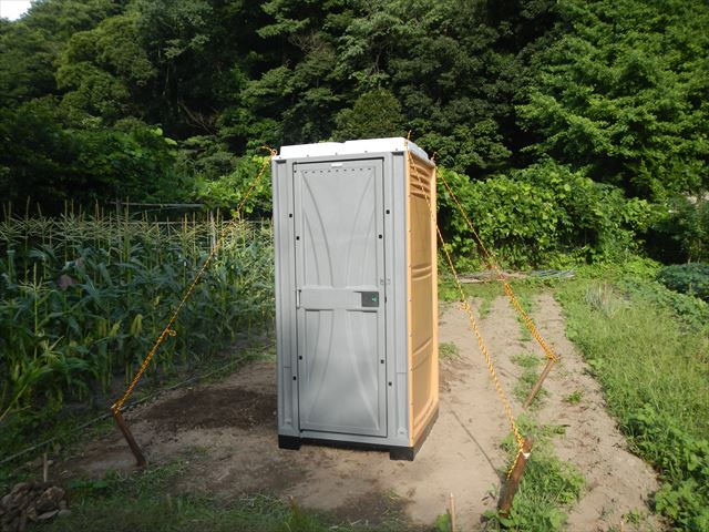 設置場所を平面に整地して、便槽とトレンチを埋める位置を決めます。